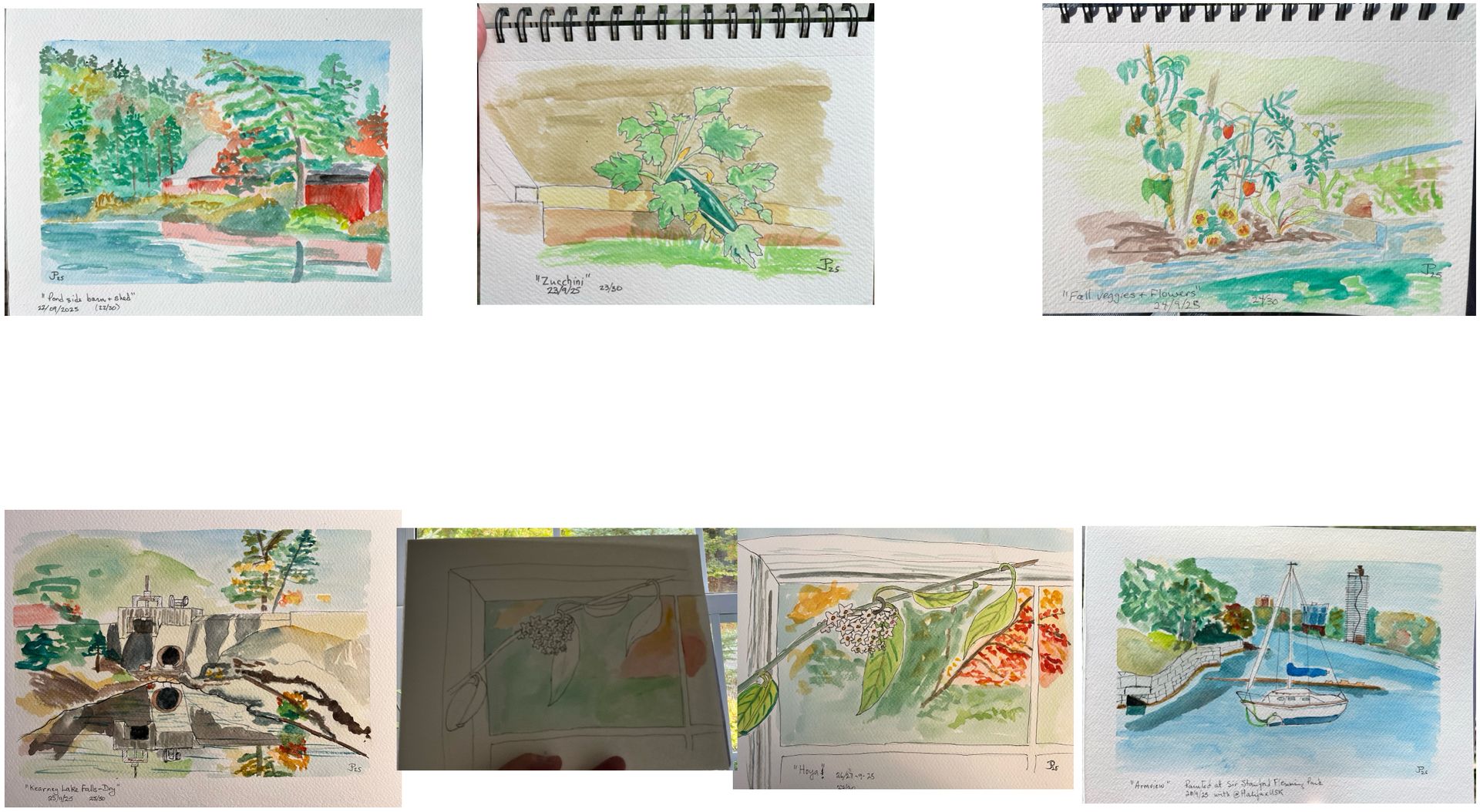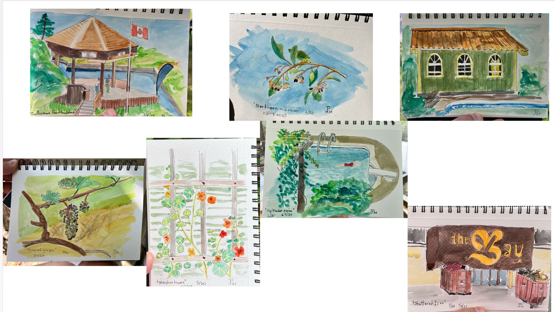 Strada Easel Challenge week 1. Sullivans Pond, wild raisin, pool shed, Concord grapes, nasturtiums, swimmer, The Bay (with @HalifaxUSK)